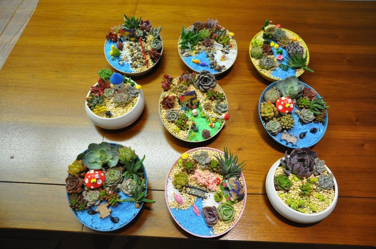 诗歌朗诵后,大家进行了巧手做盆栽的创意活动,一株株鲜嫩饱满的植物,激发了女员工一显身手的兴趣。大家从繁忙的工作中短暂抽离出来,瞬间变身巧手花匠,尽情释放自己的想象力,打造各具特色的“纯手工盆景”。无论是挑选植物进行布局,还是握着小铲填土,亦或配景调位,每个人都乐在其中。短短的时间,女职工们的巧手慧心便随着诸多精彩作品一一呈现。