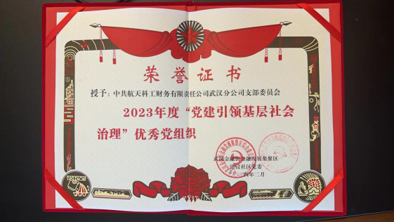 分公司党支部长期坚持以人民为中心的发展思想,以实际行动履行社会责任,积极为和谐社会贡献航天力量,被武汉金融街金融发展集聚区建设社区党委授予2023年度“党建引领基层社会治理”优秀党组织荣誉称号。(文/李强)