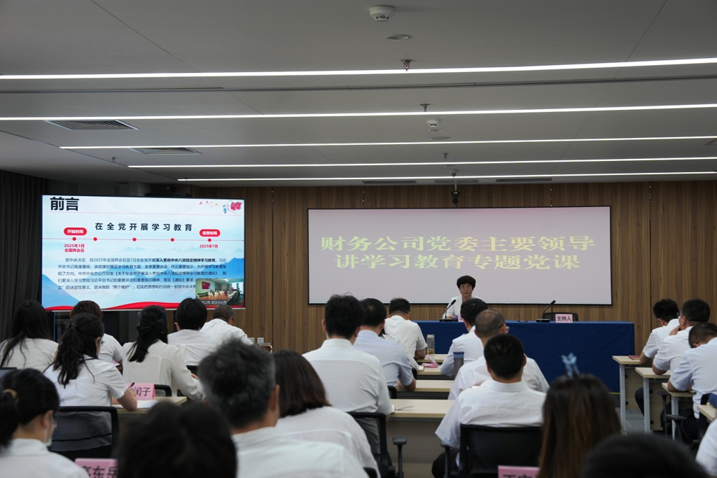 7月4日,财务公司主要领导讲授深入贯彻中央八项规定精神学习教育专题党课。总分公司全体党员和入党积极分子分别在主会场、视频分会场参加会议。