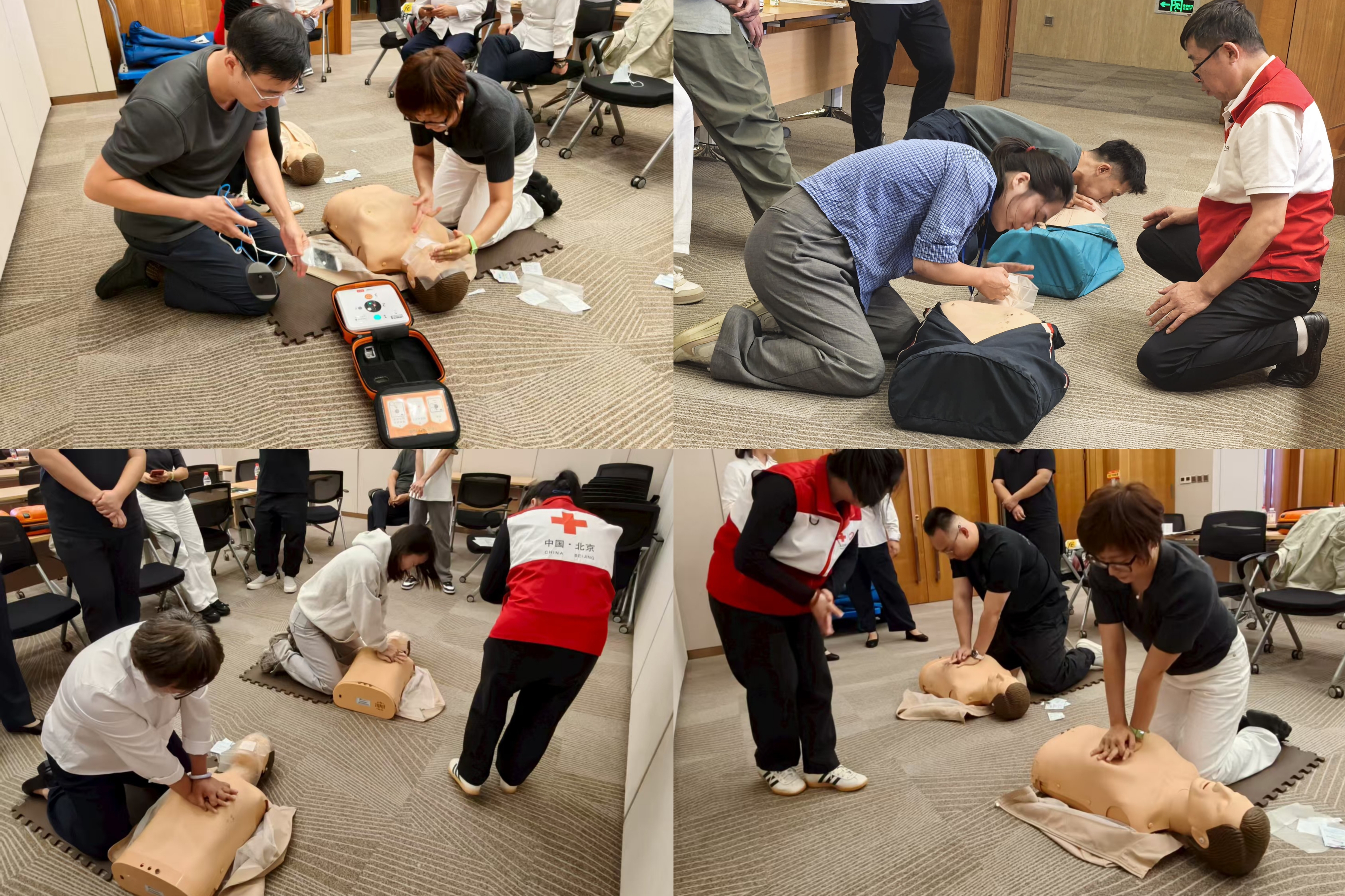 本次培训采用“理论授课+实操演练”相结合的模式。北京市红十字会培训指导老师首先为大家系统讲解了心肺复苏(CPR)的基本原理、操作步骤和注意事项,强调了“黄金4分钟”在心搏骤停救援中的关键作用,并重点讲解了AED设备的适用场景和使用规范,现场学习气氛浓厚。讲解结束后,大家在老师的悉心指导下亲手演练急救技能,通过模拟真实场景巩固所学救护知识。