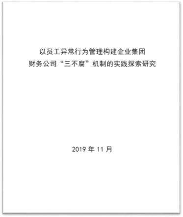 公司开展了《以员工异常行为管理构建企业集团财务公司三不腐机制的实践探索研究》课题研究。深入分析异常行为排查在“三不腐”中的作用,以金融行业异常行为管理演进过程和案例为背景,研究出一套适合财务公司的异常行为管理架构,并研究制定了《航天科工财务有限责任公司员工异常行为管理办法(草案)》。